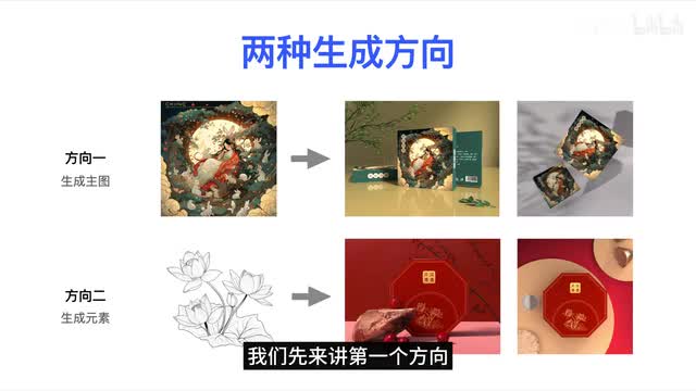 也能调整包装盒的角度和场景的灯光的渲染,出图即可。接下来我们讲解第二个方向,同样需要确定好尺寸再生成哦。这次选择用八边形的盒子,最后想做的包装效果是较为传统的烫金感的月饼包装。这个生成咒语也没有固定的形式,在这里给大家演示的是生成荷花。