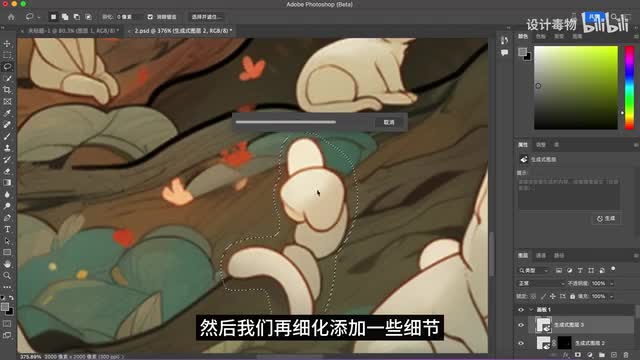 最后挑选出这张最喜欢的保存下来,放进p s贝塔版本里进行处理。不得不说p s贝塔版真的很像把多余的地方圈起来,能直接生成和画面融合的挺不错的图。然后我们再细化添加一些细节,比如缺少了的兔子耳朵以及一些光影。细化完毕后我们又遇到了问题,用m g生成的图片分辨率还不足以用来做包装印刷。