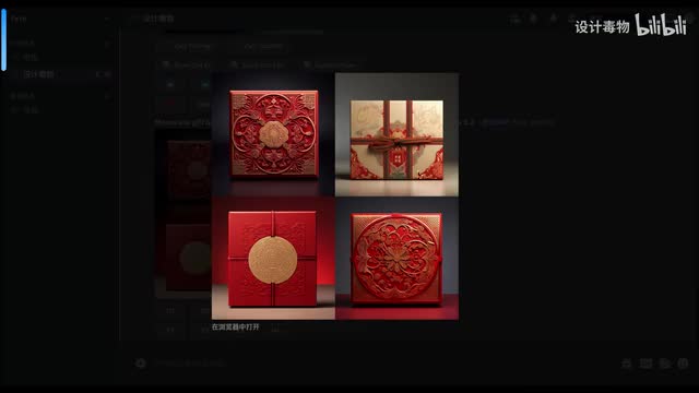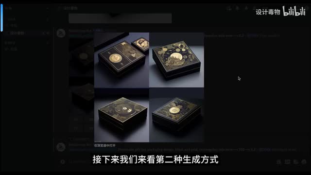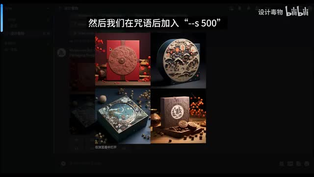 接下来我们就输入斜杠imagine来尝试一下。最开始就只输入月饼礼盒包装设计,得到的图片颜色、风格也都各异。然后我们在咒语后加入杠杠s空格五百,这时风格化就提高到了五百。生成的图片在包装表面会明显感到有更强的立体感。