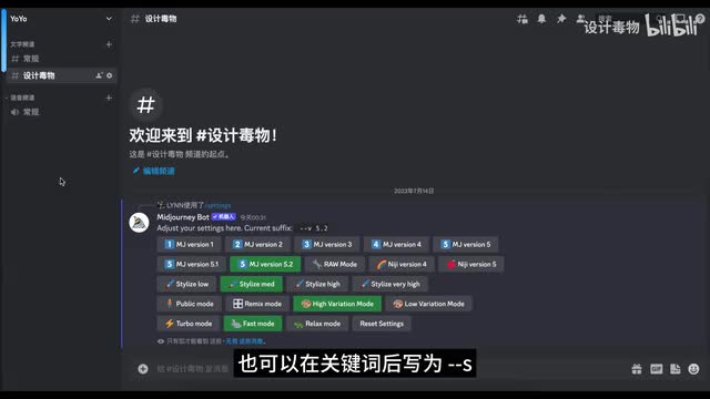 打开m g在输入框里输入斜杠setting,然后回车。因为这里需要把模式设置为目前最新的v五点二style lines。选中mad中等的style lines是风格化,除了可以在这里直接设置以外,也可以在关键词后写为杠杠s加一个空格加数值,数值的范围就是零到一千,数值越大,生成的图像就会显得更加艺术。在目前的版本里,s数值越大,在包装设计中就体现为包装的表面有更加明显的类似浮雕的立体感。