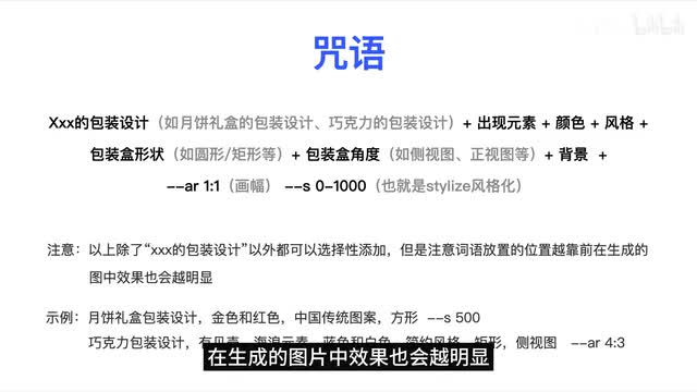 但是需要注意以上的关键词词除了某某某包装设计以外,都可以选择性添加语。放置的位置越靠前,在生成的图片片中效果也会越明显。这里有两个示例,大家可以参考一下。然后我们在m g里进行尝试,为大家具体展示咒语使用的效果。