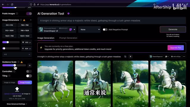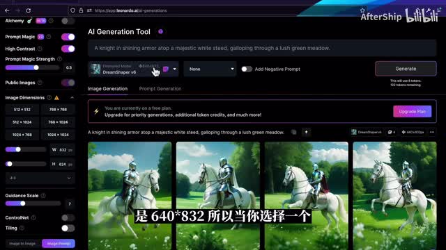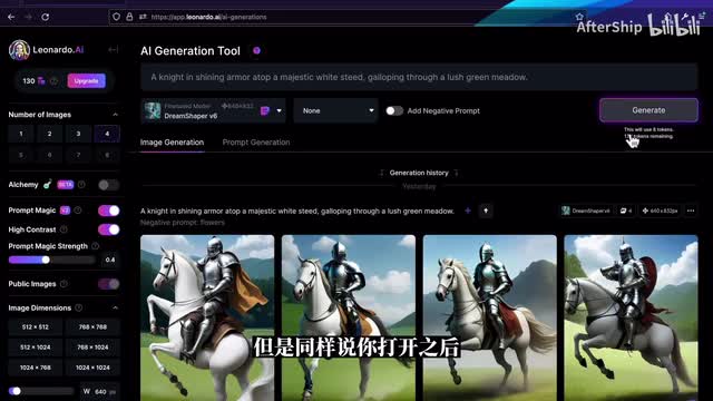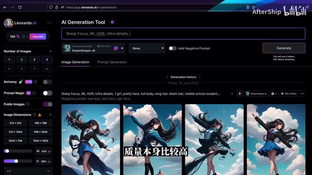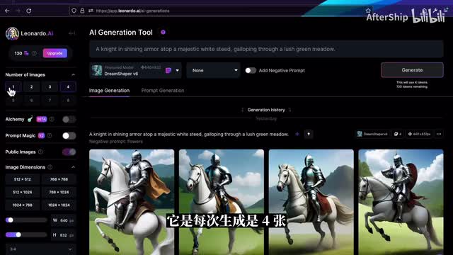 smooth的它会比较柔光的效果吧,聚焦不是特别明显。我们再来看一下图片生成左侧栏的这些工具吧,就最上面是剩余的token数量,免费用户的话每天会有一百五十个token可以领取。然后第二栏是每一次生成图片的张数,通常来说是默认它是每次生成是四张,但你可以选择生成更少。我每一张图片,如果你没有什么其他的设置的话,每一张图片会消耗一个token。第三个是alchemy,这个是leona的最近出的一个新的功能啊,但这个功能目前只面向付费用户,它提供了比如说高分辨率以及类似于h d r的这些效果。