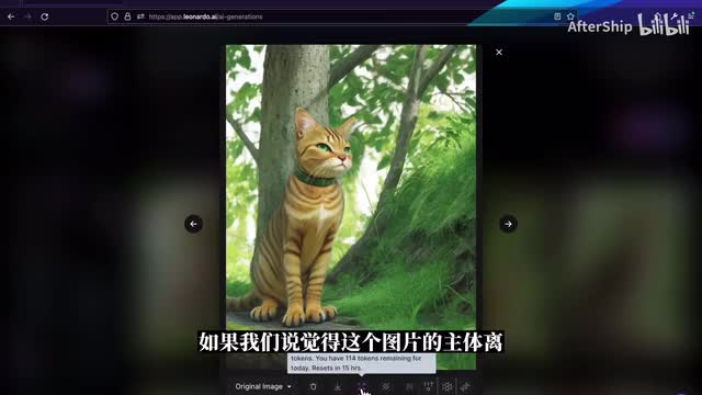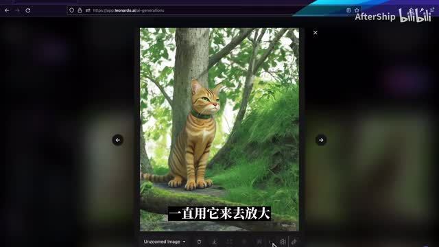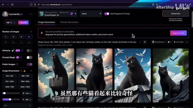 打开反向提示词之后呢,我们就写一些你不想要的元素。比如说我不想要多只猫就写multiple cat,那有时候两只也不太行吧,那我就写to cat和multiple cat。写完之后呢,我们就再点击generates重新生成一次。那新生成的你就看到它就都只有一只猫了。虽然那有些猫看起来比较奇怪,那有时候你可能没什么特别的想法,那我们可以尝试一下这个提示词生成工具,然后呢它提供了一个prompt generation,那在这个工具里面呢我们可以写一个你想要生成的主体,然后莱昂纳德会根据你的主体给出一些他觉得不错的一些提示词。