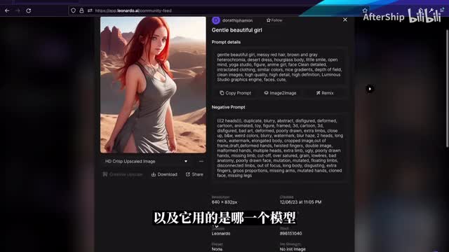 如果你没什么特别的想法的话,同样的feed是一个不错的开始。你可以从任何一个图片的呃详情页去看到它是用什么样的提示词去生成的。它的正向提示词以及反向提示词,以及它用的是哪一个模型。我们可以直接复制这个提示词,然后去尝试自己去生成一个对应的图片。接下来我们尝试着去生成一张图片,在这里我们就进入到那个图片生成工具的界面。