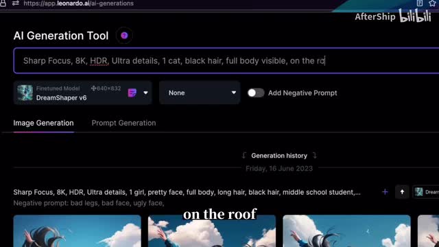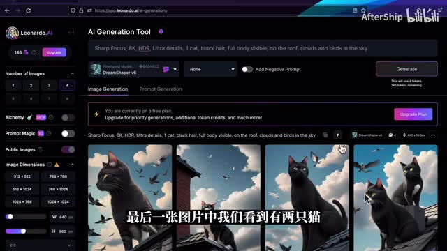 并且我们希望说这个图片它是可以看到整只猫的,我们叫full body visible。然后我们也可以描述一些这个猫的姿势,或者说它所处的环境。比如说他在屋顶上,你这on the room,比方说我们还可以再描述说背景的环境是什么样。比如说有天上有云。还有些鸟写好提示词之后,我们点击这个generate就可以生成图片了。