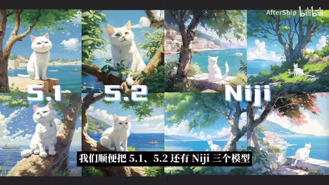 比如我们指定用native五这个模型来生成宫崎骏风格的猫。相较于标准的major模型呢,ni五五是一个更加善于去生成一些偏卡通风格的这样的一种模型。ok我们来看一下这个大图,我们顺便把五点一、五点二还有捏紧三个模型同时放出来对比一下。显然妮姐这个模型它会更加的比较动漫一点,也更加符合我们想要的宫崎骏的这样的风格。第二个我们要讲的参数是negative proud negative pro就是如果你不想要一些元素出现在你的画面中的话,我们就可以用这个参数。