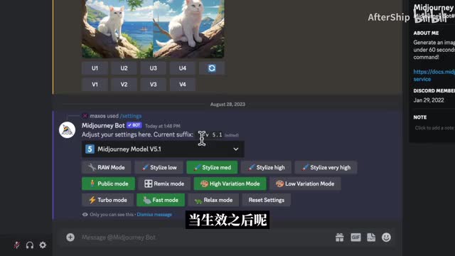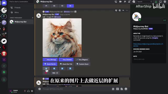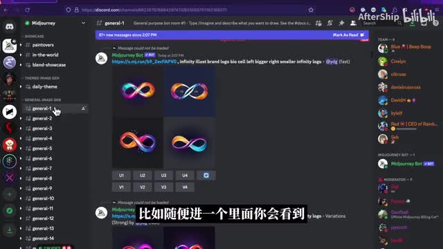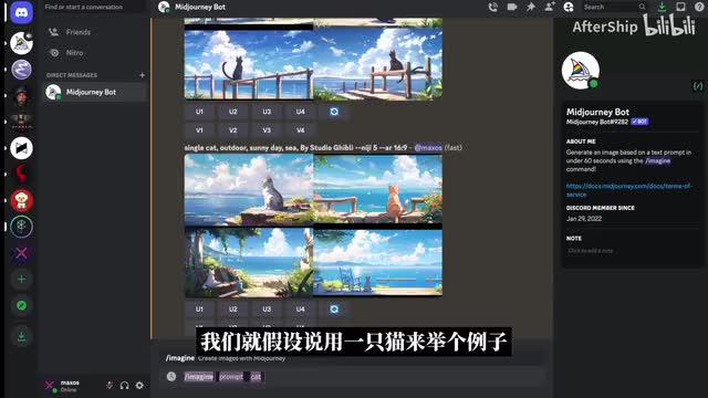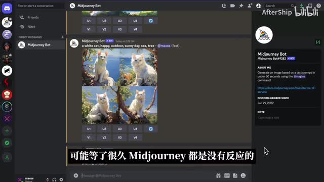 因为jenny本身是基于disco去做的一个服务。所以如果你没有decode账号的话,你通过跟着这个流程,你就可以自己注册一个。登录到discount里面之后呢,你会看到这样一个界面。比如随便进一个里面,你会看到有这样一个mid journey的boat,它就是一直在发这些图片,这里有他的那个提示词。然后这有一个人其实意思就是说这个人他用这些铁质子来生产这些。