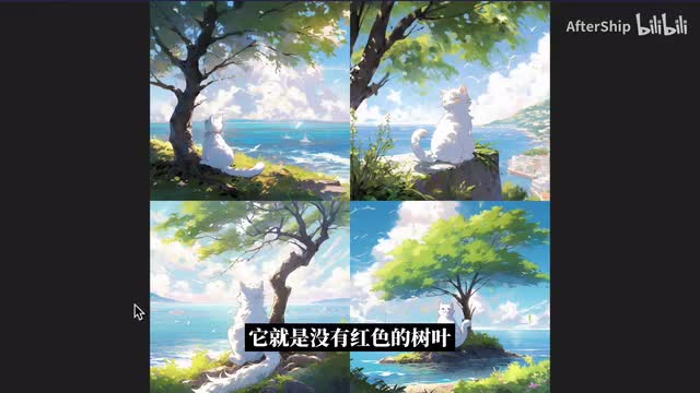 嗯,同样还是以这个猫为例啊,比方说我希望它是在海边,我希望天气是晴天,还有一些树。第三个部分我们来说风格,风格其实大概可以分成几种。比方说你想要写实风,或者是偏卡通的,或者是比如说油画。那不同的风格呢它所用到关键词也会不一样。比如说写实风,我们通常可以用到一些啊像光线,或者是光圈,或者是相机的一些具体的参数。