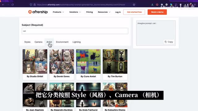 比如说我点击下边或者右边的那它大概率会在那个地方把猫的身子给画出来。说了这么多,你可能还是会觉得这个pro写起来真的很麻烦。所以我们专门做了一个免费的工具,我们收集整理的me jenny常用到的一些关键词,把它分类,按照style camera artist的environment以及lon这几个维度去进行描述。你只需要在这里写下你想要的subject,然后选择对应的一些关键词,然后直接复制最终生成的proud去mar里面直接生成,非常的方便。好了,以上就是本期视频的全部内容了。