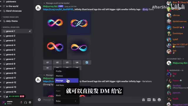 对,你可以看到这里有很多操作,你可以直接去操作这些图片,或者你自己可以直接在这里去生成那个图片,都是没有问题的。只不过说你所有发的东西,其他人都是可以看得到的。你可以直接点这个boat,就可以直接发d m给他他就会进到你的d m这个界面里面,你就可以直接跟他去聊天。你要去发一些指令的话,我们就可以通过斜杠,你这里是可以看到他所有支持的这些指令的。作为生成图片的话,我们最常用的其实就是。
