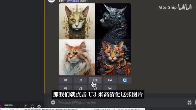 我们最开始提到的四张图片的顺序嘛,那这里的u一到u四以及v一到v四分别对应的就是高清化某一张图片,或者以某一张图片为基础去生成它的变体。比方说我觉得第三张图片还不错,那我们就点击u三来高清化这张图片。稍微等待几秒钟之后呢,我们就生成了高清化的第三张图片。同样我们可以点击这里的v四,来以第四张图片为基础生成四张不同的变体。变体同样也会直接生成四张。