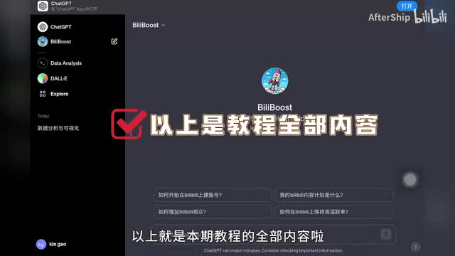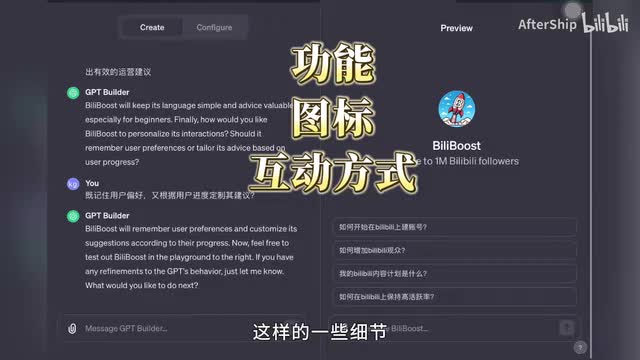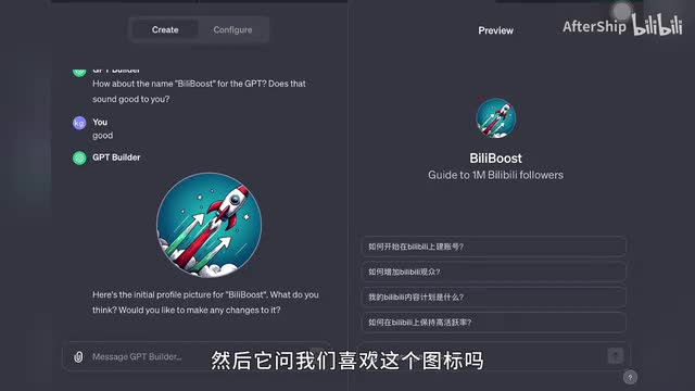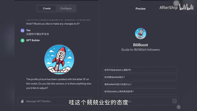 然后他会问你,他可以帮你做一个g p t,可以给他一些指令。啊,我举个例子啊,我就会让他去新建一个新的g p t,然后这个g p t的一个功能是帮助人们从零到一的搭建一个一百万粉丝的必哩哔哩账号。ok完成。