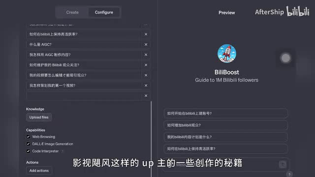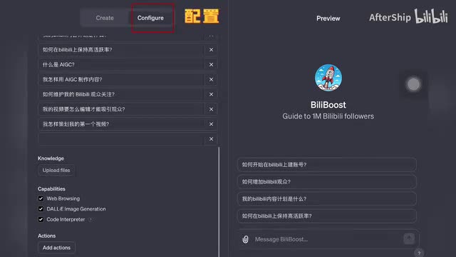 ok它已经增加了一些新的问题了,呃,这个a p p就是已经制作完成了。好,接下来我们进入教程的后半部分,就是这个configure就是配置。它里面是可以调整挺多设置的,像名字简介、描述以及和用户一开始交互的这些问题,都可以在这里做一些调整。
