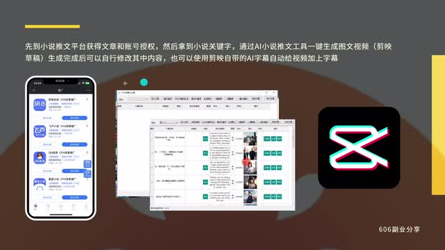 然后呢,我们首先是要先搞到这个小说推文的文章账号授权啊,就是我们先要找到这个文章授权啊,比如说番茄小说的授权,对吧?然后进行一个报价说明,然后再利用我们这个a i推文工具。它可以一键导入啊一段儿一段儿一段儿一段的文案,然后去批量生成这个画面。然后还有就是一键配音,然后我们再把图片以及声音一键导入到这个剪映上面。