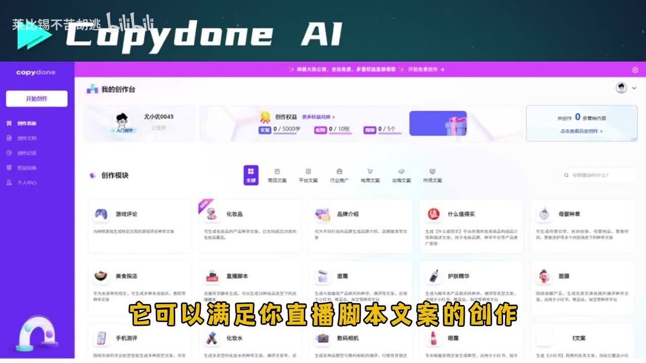 第二个,copy down a i这是一个专门a i辅助你做内容创作的平台,里边有非常多的模块,你可以根据自己的需求选择不同的模块,它可以满足你。直播脚本文案的创作,品牌介绍文案的创作,以及各类测评类文案的创作等等等等。而且它创作的文案可读性非常高,为很多m c n机构节省了聘请文案专员的成本。