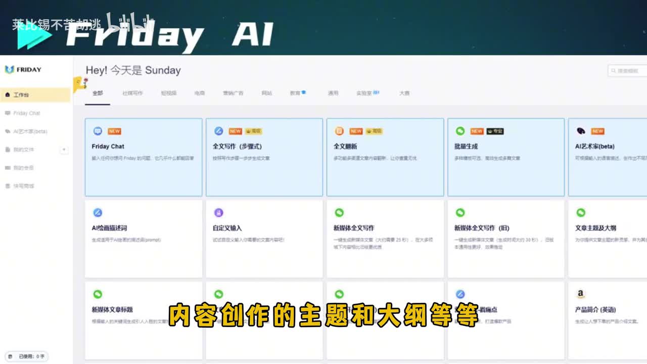第三个,friday ai这是一个帮助你创作原创文章的平台,里边啊也有非常多的模块。它可以帮助你写短视频的标题内容,创作的主题和大纲等等。比如它的标题创作模块,你只要在左侧描述你想写的标题的内容,它就会帮你自动匹配标题。