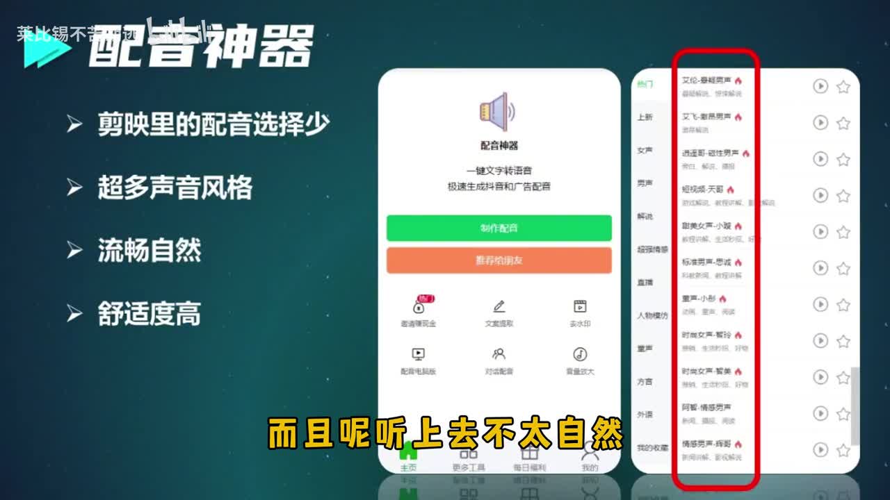 第五个,配音神器,很多在做影视解说好物分享等等需要a i配音的朋友啊。可能觉得剪影里边的配音选择太少了,而且呢听上去不太自然。那么这个工具里边就提供了超多这种声音的风格,而且呢大部分听上去都非常流畅自然,舒适度啊非常高。