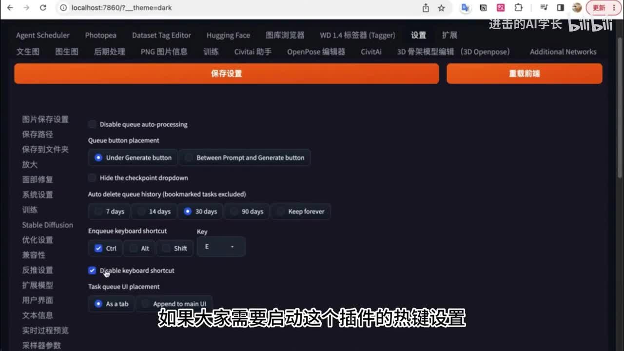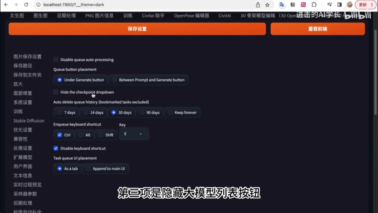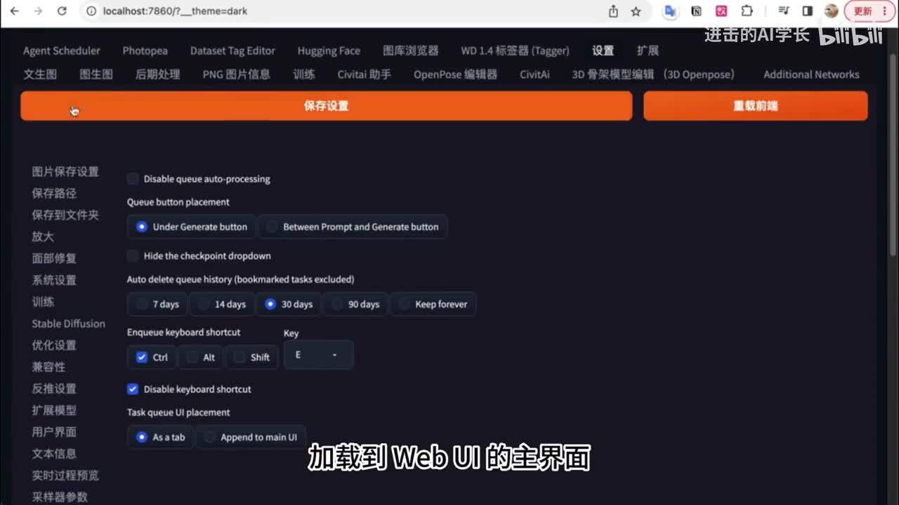 一个选项是作为tab在stable diffusion的最上方显示,这是我比较推荐的方式。另一个选项是把插件的界面加载到y b u的主界面。我不建议这样做,因为这样会让页面变得太长,不便于观看。设置完成后,点击保存设置,然后重启前端即可使用。