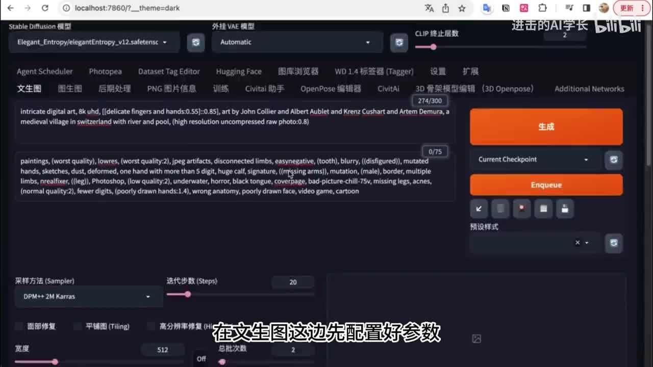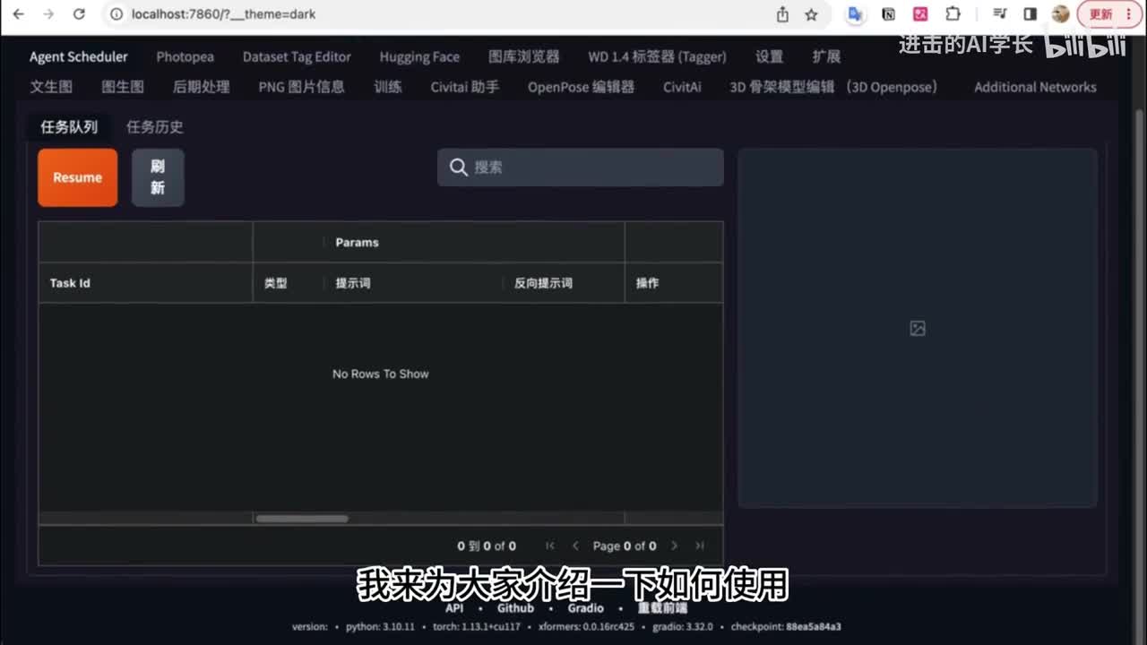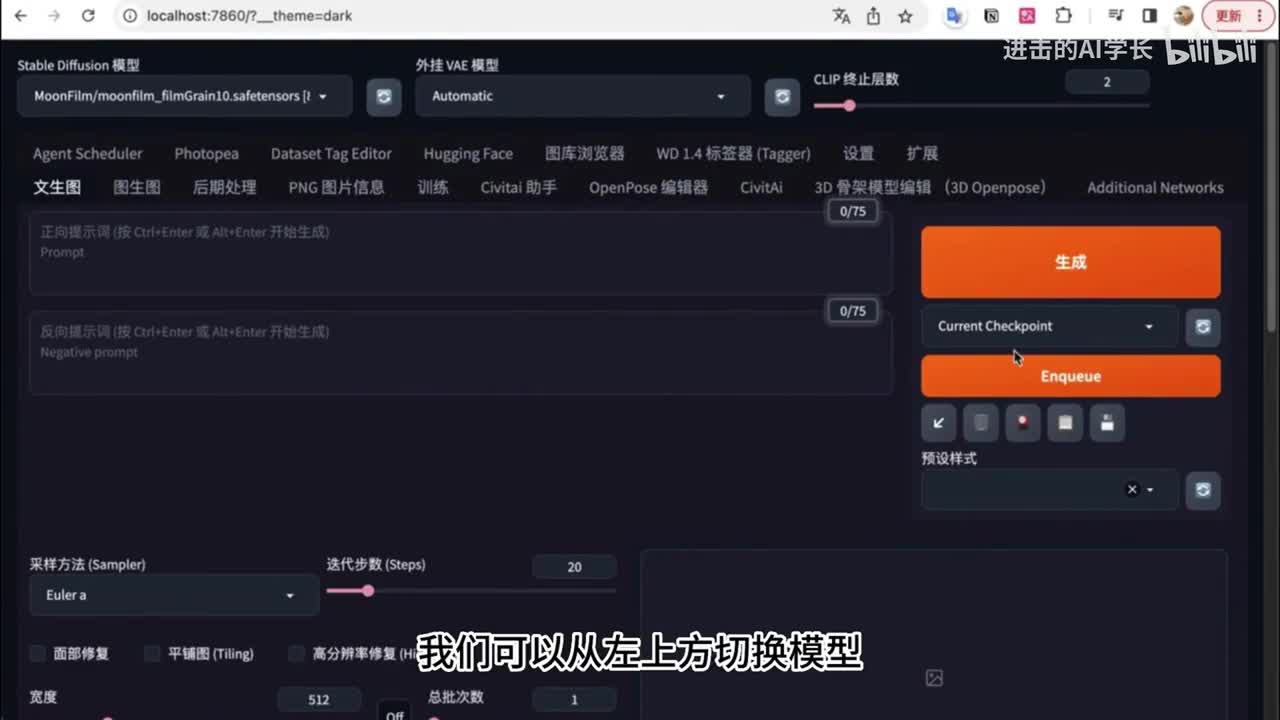 重启后我们可以在文生图或图生图的界面看到右侧有了一些改变,增加了一个大模型的选择列表和一个排队的按钮。我们可以从左上方切换模型。但这需要花费时间,而从插件添加的大模型列表里切换则不需要等待时间,非常方便。接下来我们可以点击排队按钮。