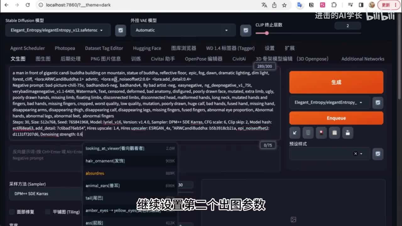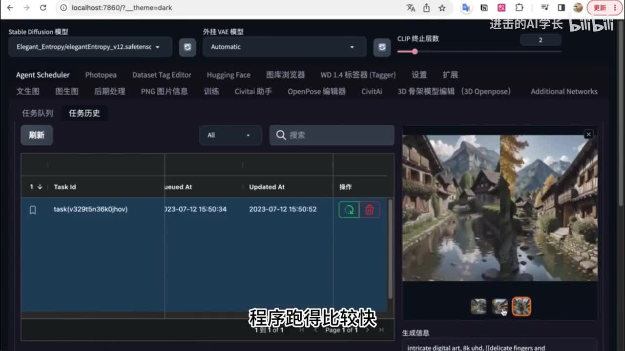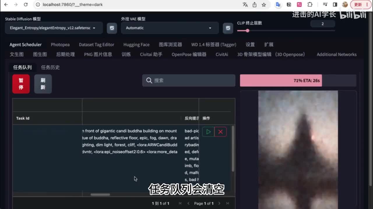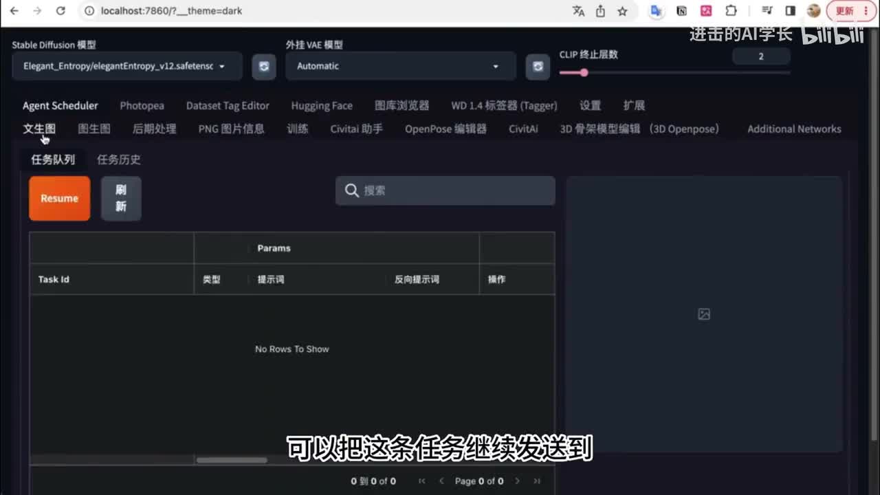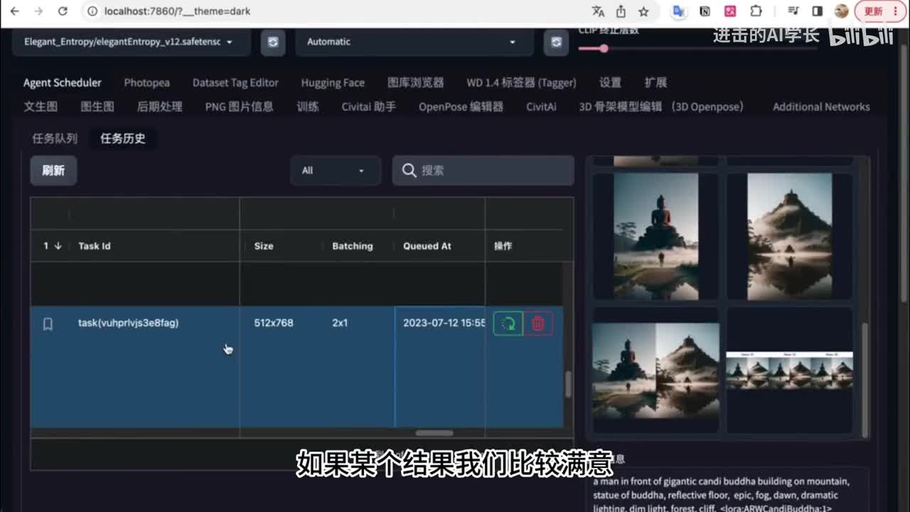 以及图片的生成信息,包括提示词、负面提示词、迭代步数、采样方法、大模型等参数。如果我们想对这个任务的参数进行修改,可以把这条任务继续发送到文生图或图生图进行修改,然后继续执行排队出图。接下来我来演示一下如何批量挂机出图。比如晚上我们人类要去睡觉了,但不能让a闲下来。