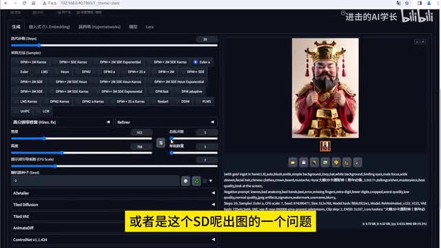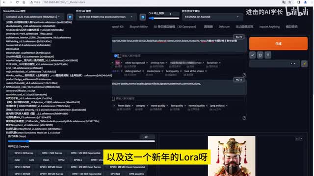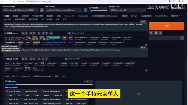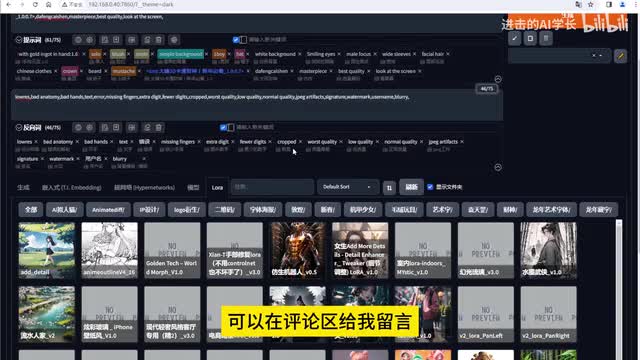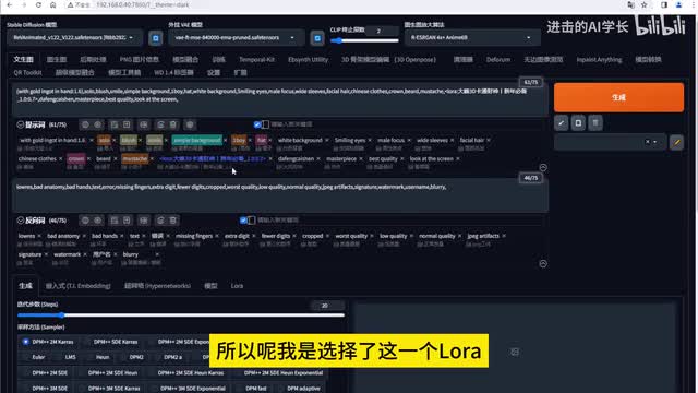 当然我们仅仅这样去描述呢,是不足以去生成这一个财神的那我们必须要去搭配着lower来进行使用,才可以去生成这样一个财神的i p形象。所以呢我是选择了这一个lower,然后的反向提示词呢就是一些防止第一质量的一些图片的进行产生。然后接下来呢就是去啊输入参数部分。