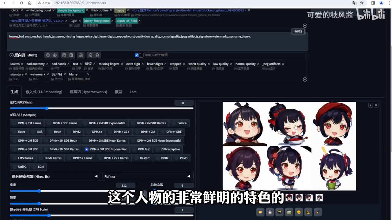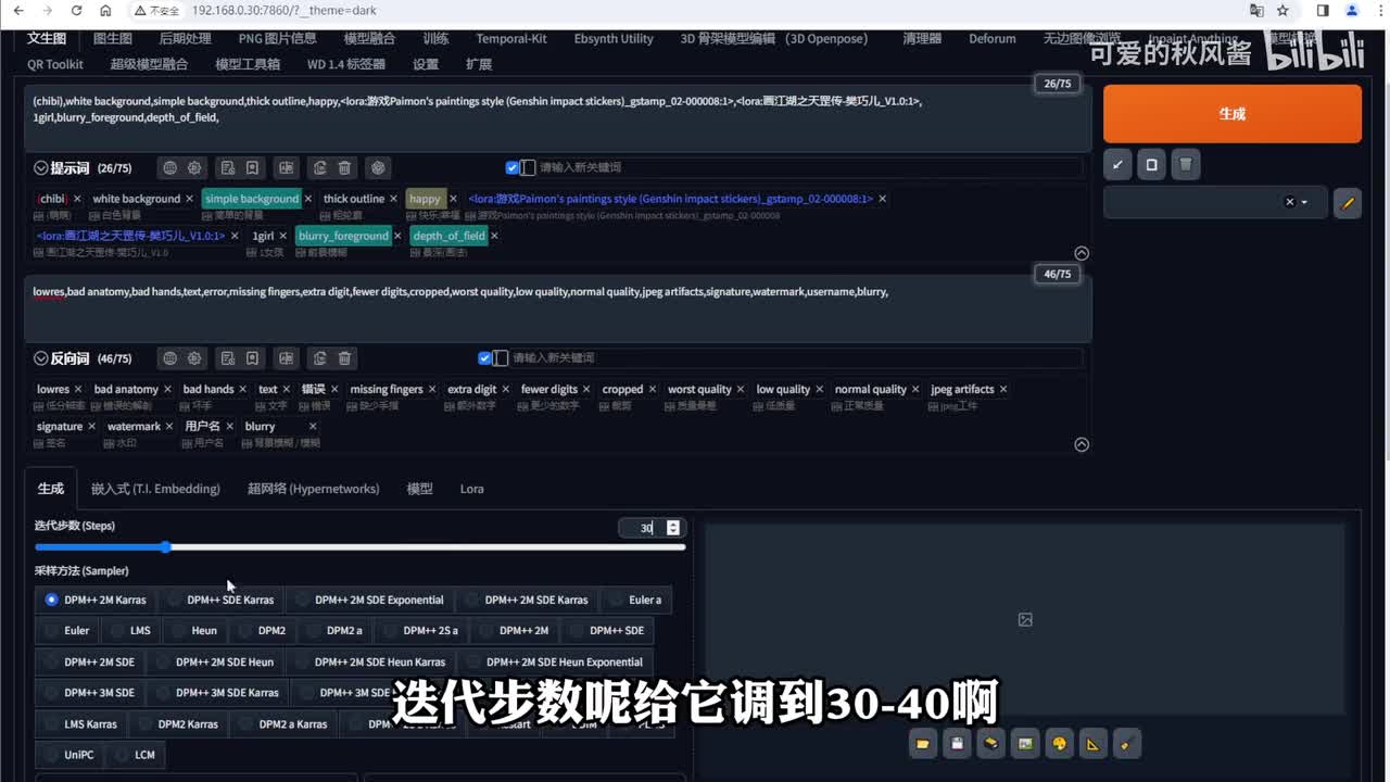 这里呢我也是有很多的这个人物laura,那我把这个laura a也添加进来,接下来呢我们就是去修改相同的参数了,迭代步数呢给它调到三十到四十啊,就想看更多细节采用方法,我是选择了这个d p m加加三个m s d e这个采样方法,然后分辨率啊就是五幺二乘五幺二的一个正方形的图片。那我们多生成几张来供我们去挑选。