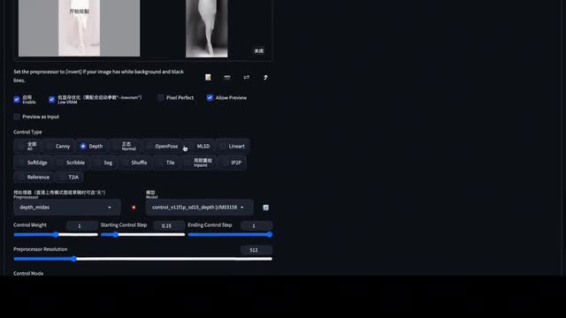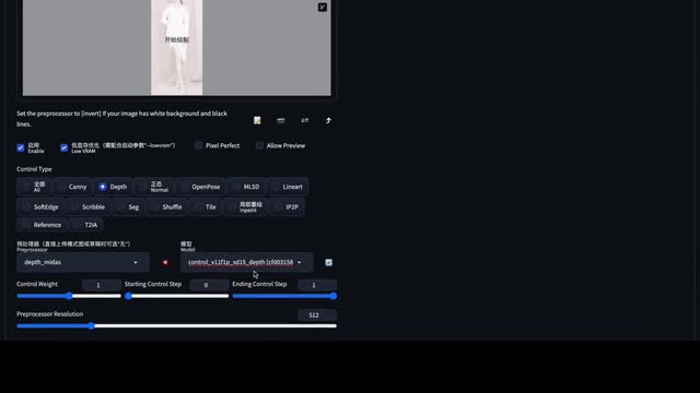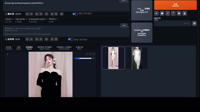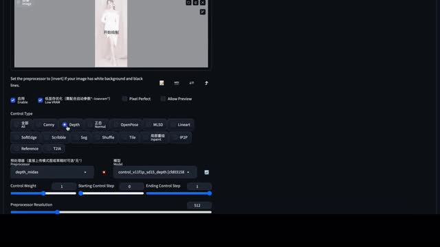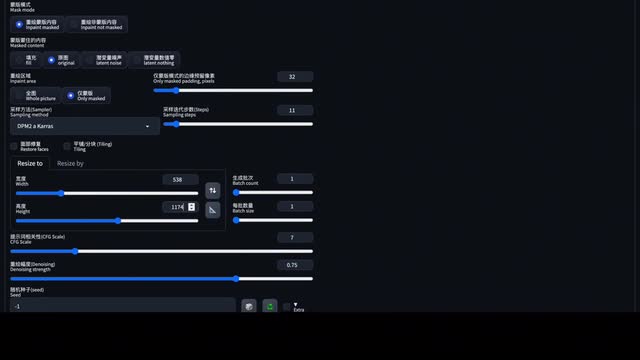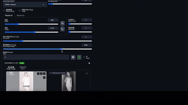 重绘区域选择谨蒙版采样方法选择d p m r carries尺寸改成图片的尺寸。重绘幅度零点七五,模特图粘贴到control net。
