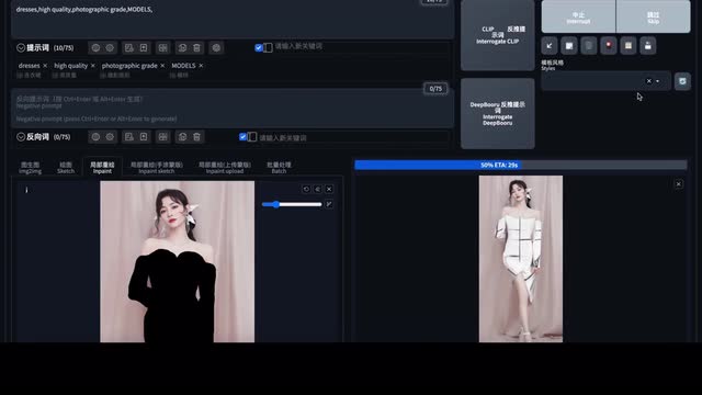 接下来给大家分享control net插件应用案例,stable diffusion人物换衣服。选择magic mix realistic大模型,点击图生图,点击局部重绘模特图,复制进来,绘制蒙版区域。