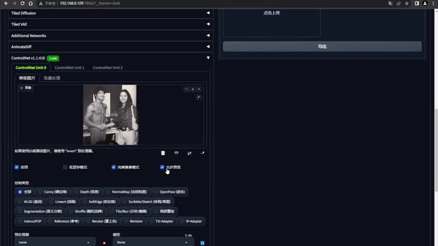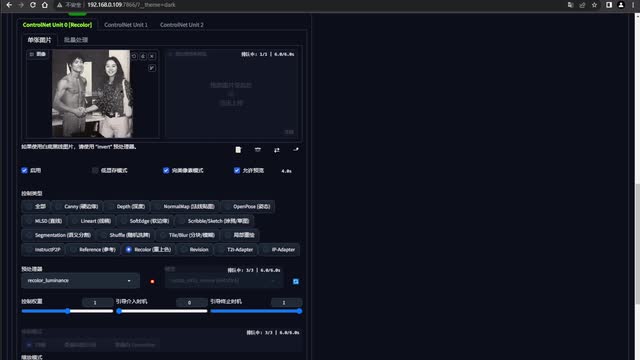 然后点击这个按钮,就是上传我们的原图尺寸,在这里进行同步。然后我们要勾选启用,勾选完美像素,然后勾选我们的允许预览,我们的控制类型呢选择我们这一个重上色recall了。咱们。