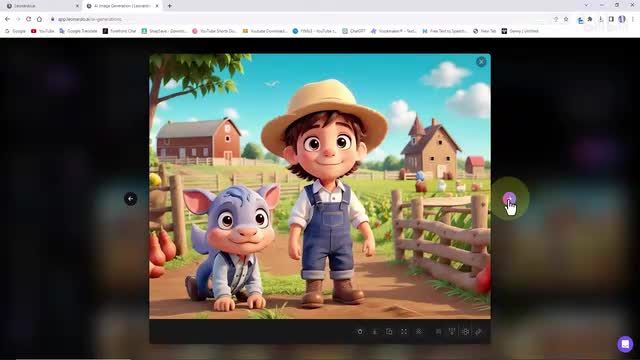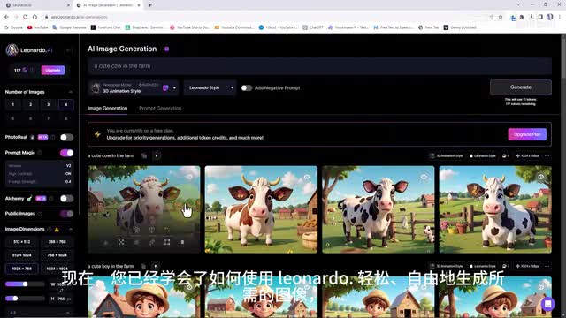 然后单击生成按钮。三d动画风格的立方体男孩图像就生成了。还有一个使用leonardo生成动物图像的示例。我们修改一下提示词,然后单击生成按钮。