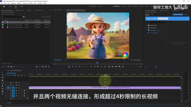 将新动画导入premiere,并使用播放操作将其放置在时间线的末尾。现在可以看到第二个视频从前一个视频的末尾开始,并且两个视频无缝连接,形成超过四秒限制的长视频。通过重复相同的技巧和过程,您可以显著延长。视频的长度,以便在premiere pro中执行此操作,将画面放置在最后一帧,并捕获静态图像。