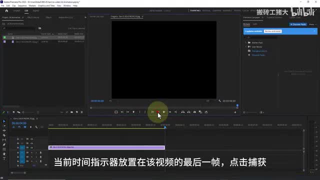 我通过单击并拖动将视频放到时间轴上。为其创建一个序列。这里是将当前时间指示器放置在该视频的最后一帧,点击捕获,捕获最后一帧的截图,然后存储下来,保存它。
