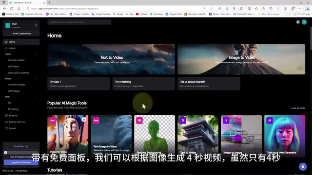 我们创建一个runway网站上的免费用户账户,带有免费面板。我们可以根据图像生成四秒视频。虽然只有四秒,但完全不用担心。我在第三部分中会教延长视频长度的方法。