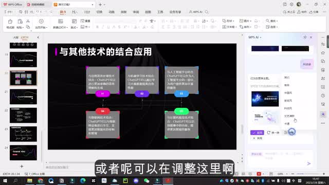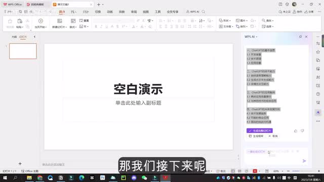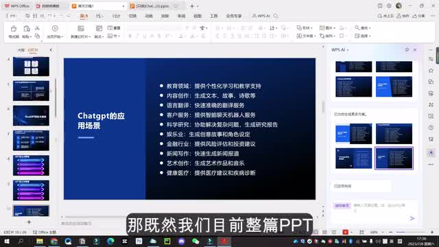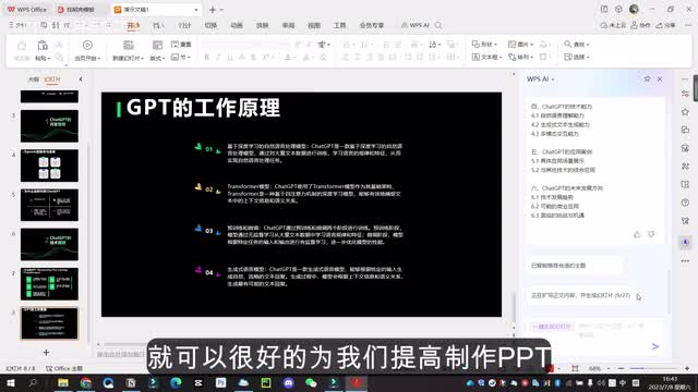 那目前呢他已经呢在持续的为我们生成这个幻灯片呢。我们在这里啊可以看到它正在对全文进行一个扩写,并且呢将生成啊二十七张的一个幻灯片。我们利用这个w p s a i就可以很好的为我们提高制作p p t的一个工作效率了。那你甚至啊还可以去淘宝接一些p p t创作的一些单子,实现啊利用chat g p t和a i工具的一个赚钱。那现在呢一篇完整的p p t啊,它就已经为我们生成了。