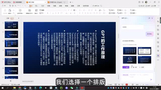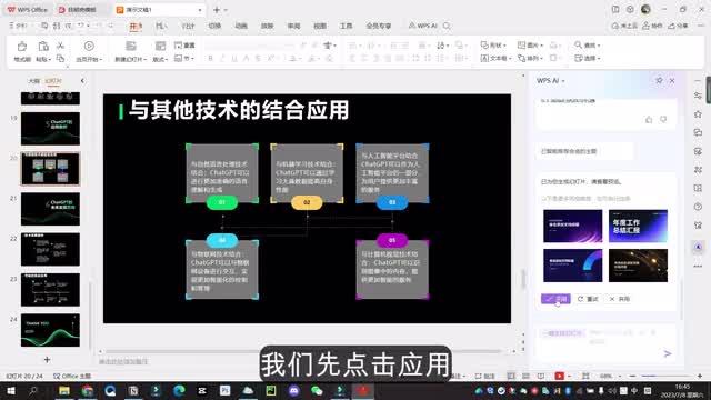 输入我们想要的一个主题,比如说的应用场景。我们创建单页,那这边呢这新的一页就我们重新创建出来了,我们可以点击选择排版。好的,大概就是目前的这么一个思路。那既然啊我们目前整篇p p t就已经完成了,我们可以啊要求这个w p s a i呢为我们生成啊全文的一个演讲备注,方便啊我们在现场啊进行一个p p t现场的一个预训练演讲。那这边呢就显示啊正在生成演讲的一个备注。