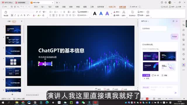 如果还不满意的话呢,我们可以啊再持续更改就好了。那最后一步啊就是对这个w p s a i生成的p p t啊进行一个微调。比如说加入一些个人信息等等。演讲人我这里直接填我就好了。全链接。