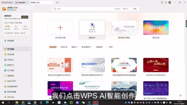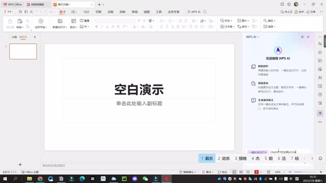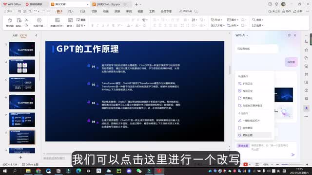 包括啊利用chat g p t来生成大纲,以及啊利用w p s a i来编辑和生成内容。请大家跟着我一起学习,一步一步啊实现我们高校工作的一个梦想。那我们首先呢先来打开我们的一个w p s a i,我们点击新建,然后新建一个p p t,我们点击w p s a i智能创作。那大家可以看到右侧的这个对话框呢,就是我们w p s a i的一个对话窗口了。我们在这里可以点击一下,我们可以看到它可以对我们的全文进行扩写和改写,可以对单页的p p t进行美化,还有啊这个一键生成演讲备注,还有一键呢生成幻灯片,同时呢可以对单页进行一个创作,还有更换主题。