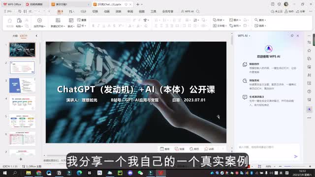 那我们呢也可以看到使用chat g p t和w p s a i呢,我们呢可以在非常短的时间内生成一份完整并且专业详细的p p t,节省了我们大量的一个时间和精力。而且啊目前w p s a i啊它是免费就可以使用了,可以啊帮助我们制作出非常专业和美观的p p t。那么呢我分享一个我自己的一个真实案例,让大家看到生成p p t的一个实际效果吧。我前几天啊使用chat g p t和w p s a i啊制作了一个关于a i工具应用的一个公开课p p t。结果啊吸引了大量的粉丝啊来观看,不仅呢帮我节省了大量的时间和精力,而且呢由于其专业和美观呢,也赢得了学员们的一个高度评价,以及对a i工具的一个认可。