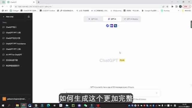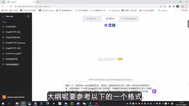 我们把我们想问chat g p t的一些问题啊,直接文字编辑,然后输入到这里。最后呢在这里啊chat g p t就会进行一个输出了。那目前呢因为我已经呢开通了chat g p t四点零,所以啊我就使用chat g p t四点零来为我们演示一下如何生成这个更加完整专业的p p t大纲。我们可以选择插件功能chat g p t四点零呢可以获取到目前互联网的一个最新信息。那我这里啊我先告诉他,你想象一下你现在是一名a i领域的专家,同时呢你还是一名啊p p t制作的大师。