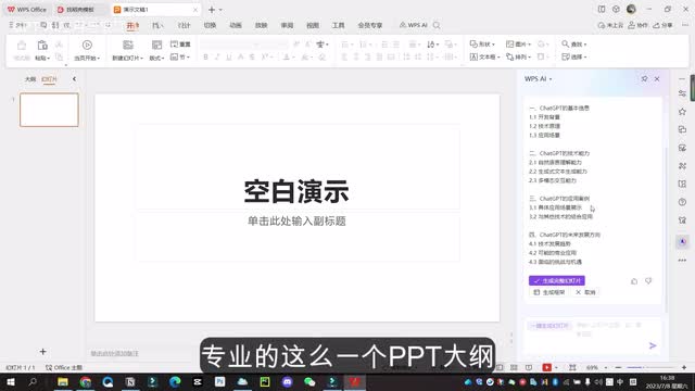 好了,目前一个啊专业并且全面的一个p p t大纲呢,chat g p t四点零呢就已经为我们生成了。我们把这个大纲啊进行复制一下。那我们接下来呢再回到啊这个w p s a i的一个页面里面。我们点击发送。然后啊我们再点击生成完整的一个幻灯片。