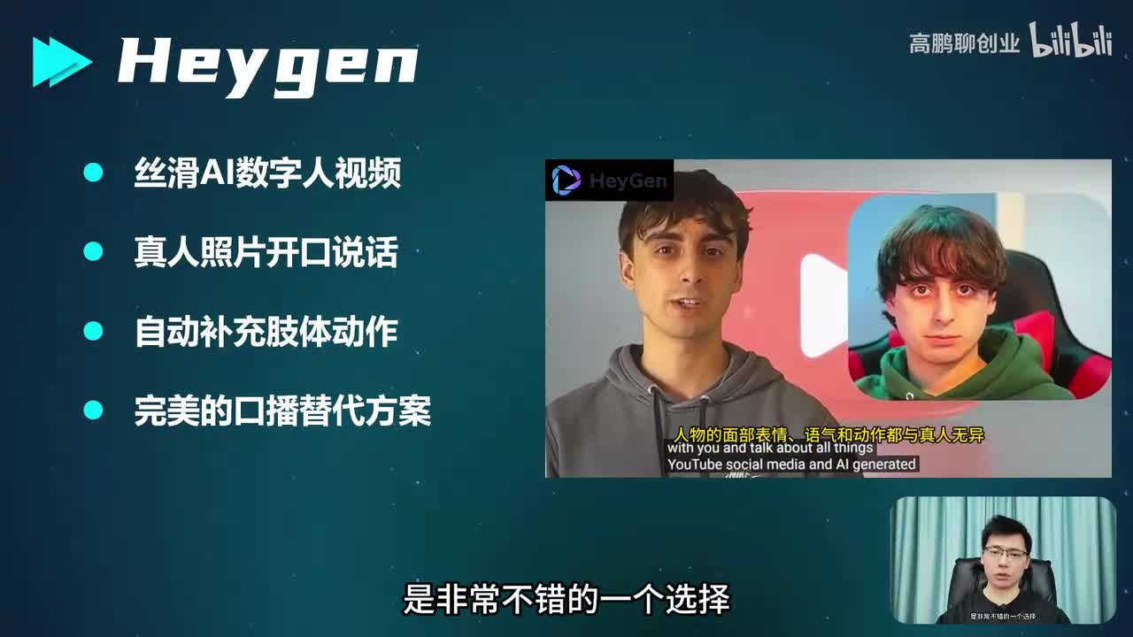 第三款呢就是heygen啊,我在之前给大家分享过很多次啊,这款工具呢确实功能非常强大,它也是一个付费使用工具。目前来说主流的你看到的比较丝滑的啊,效果比较完美的这种数字人的a i视频啊,基本上都是用heygen生成的。你只要上传一张真人的照片啊,就能够让这个真人开口说话,而且配合一些肢体的动作,整个视频看上去非常的丝滑,非常流畅,就好像是真人在说一样。