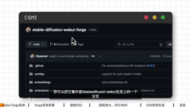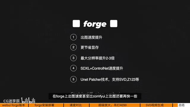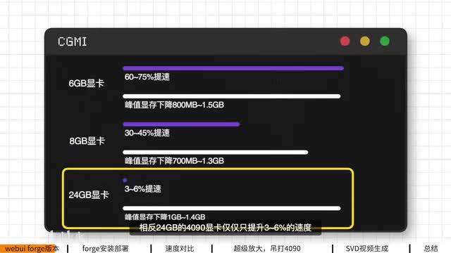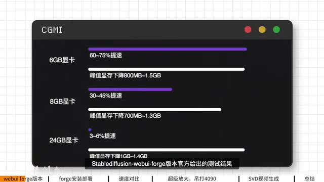 通过加入u i p patra补丁技术,现在web u i forge也能支持s v d生成视频了,瞬间auto u i就变得没那么香了,就连automatic一一一一一也为此点赞贡献了。总结一下stable division web u i forge版本官方给出的测试结果,八g b的显卡在forge上能够获得百分之三十至四十五的速度提升,峰值显存能够下降约七百m b至一点三g b之间。性能相对差一点的显卡提升幅度会更加的明显。