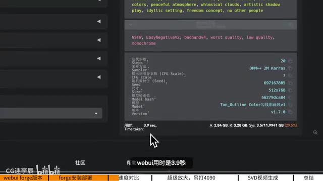 我的显卡是四零七零super十二g b输入简单的提示词,生成一张五一二乘七六八的图片。web u i用时是三点九秒,显存占用率是百分之二十九点五。来到forge同样的提示词,同样的参数设置,生成完全一样的图片。