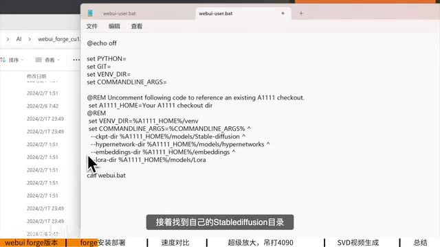 现在我们简单修改一下这里面的代码,就可以让forge和web u i共享模型库了。首先把r e m这些前缀全部删掉,接着找到自己stable division的目录,把这个目录地址粘贴到home等号后面。这时候要注意,必须把路径的反斜杠全部换成下面一样的正斜杠。