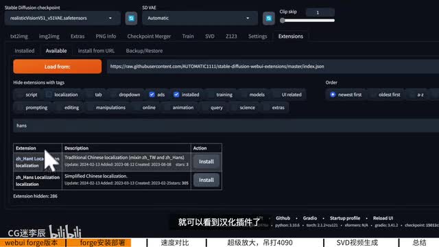 forge手动安装插件的方法和web u i是完全一样的。来到扩展页面,加载一下扩展列表,搜索h a n s,取消本地化的勾就可以看到c插件了,选择这个进行安装。然后重启一下界面,在设置里面找到用户界面,然后选择刚刚安装的汉化包保存一下。