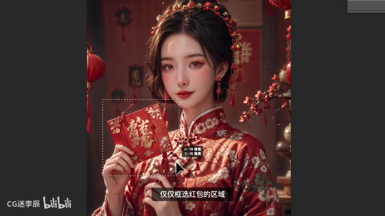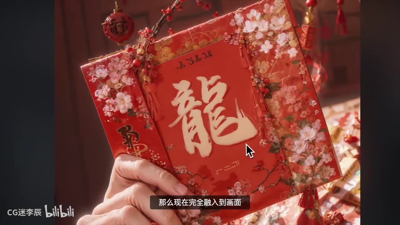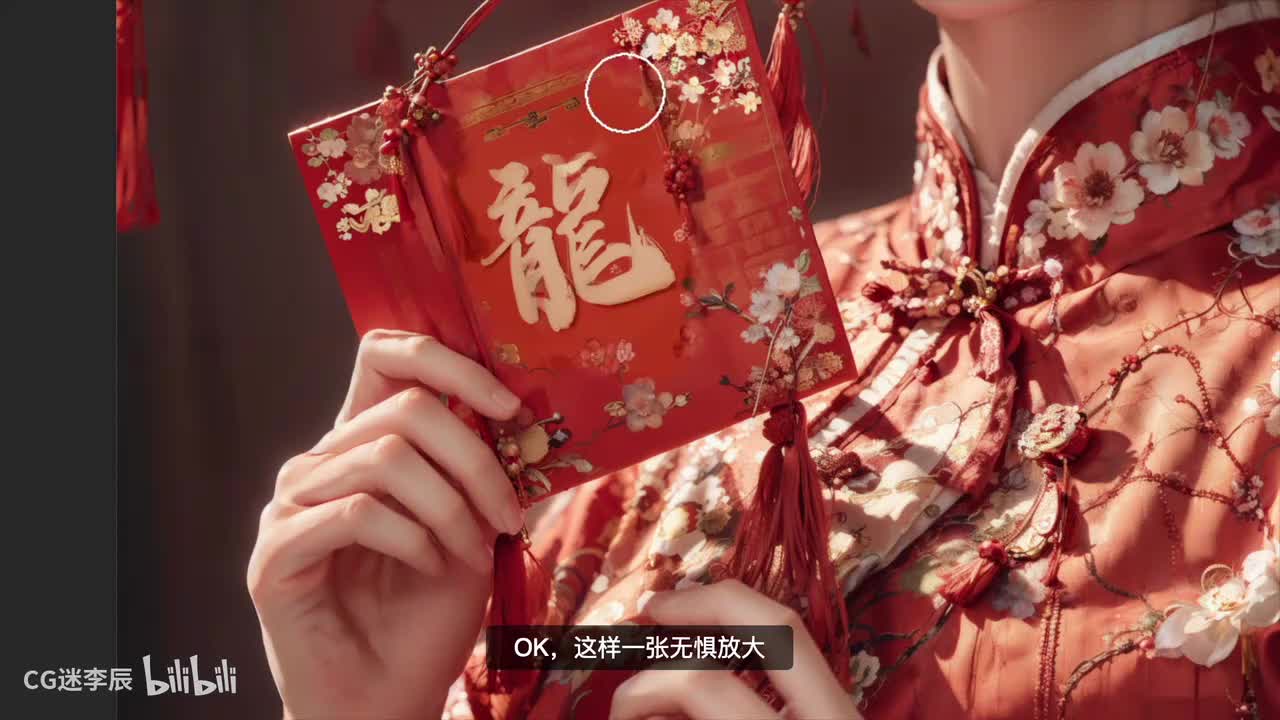 接着开启高清修复,放大一下图片,在两个图片的控制下,美美的照片就生成好了。但现在红包的字还是有点问题,我们把这个图片导入到p s,仅仅框选红包的区域,用画笔工具直接把乱码的字涂抹掉,手动输入一个龙字,放大并旋转一下,匹配好红包的位置,同时加上投影增加立体度,这时候把这个图片加载进来。