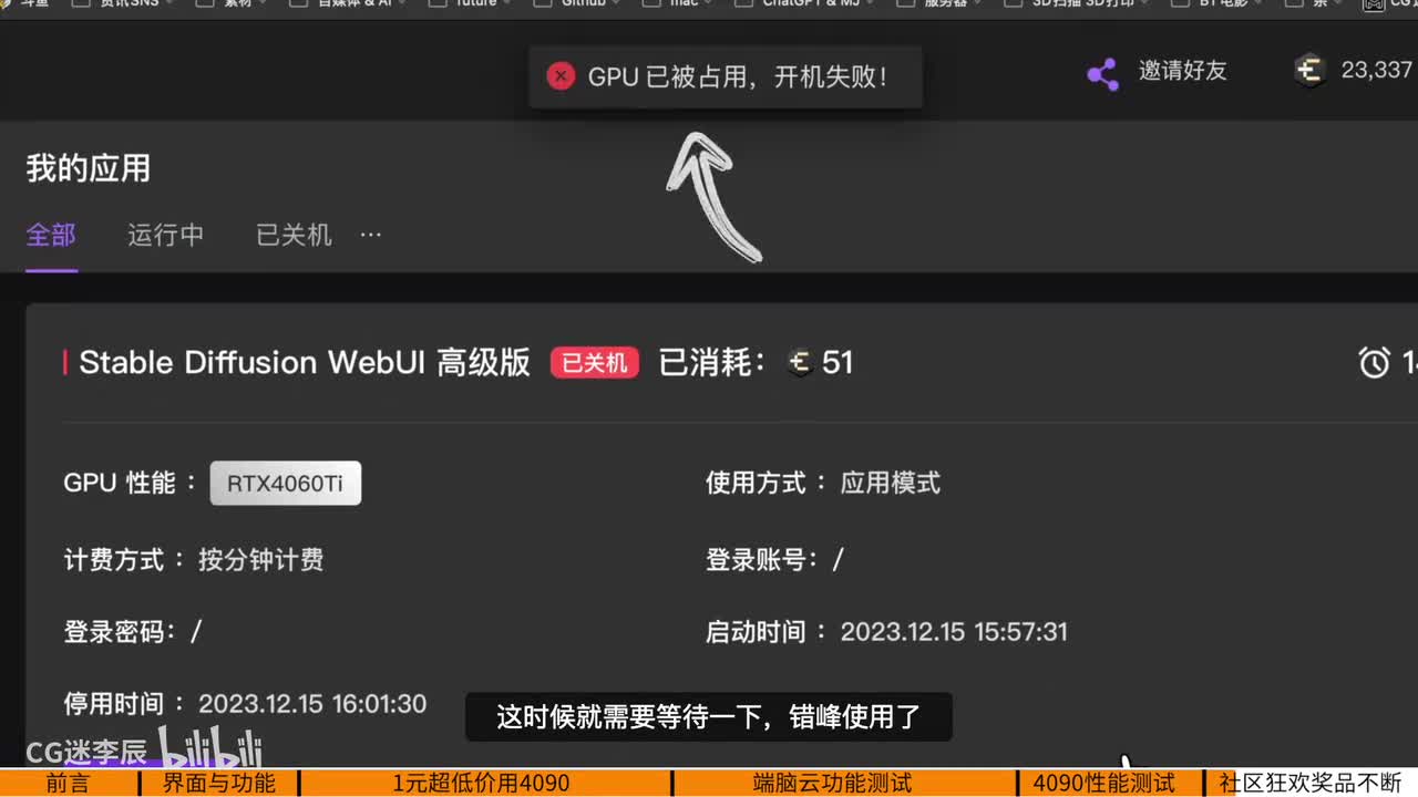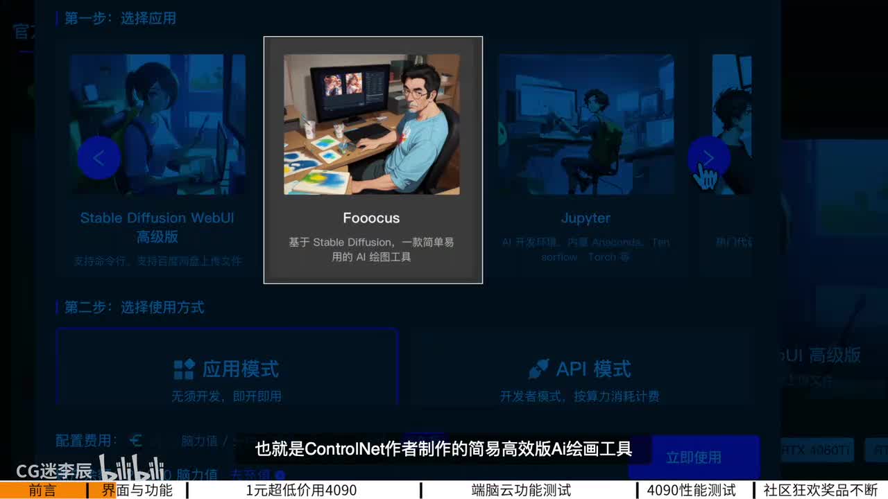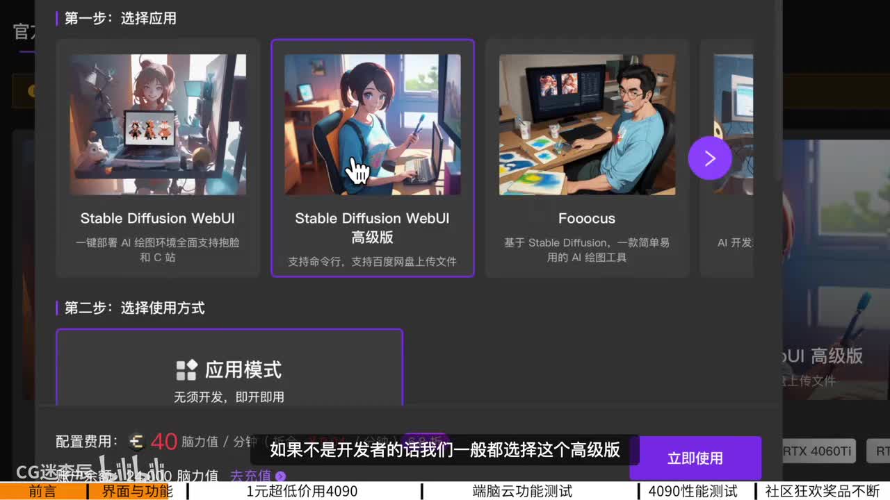 这里我们选择高级版stable diffusion web u i,它相比旁边的这个普通stable division版本会多出一些类似的显卡,同时还支持命令行和百度网盘上传功能,可以选择也会更多一些,重点是价格和普通版是一样的。如果不是开发者的话,我们一般选择这个高级版本里,可以根据自己的需求选择不同性能的显卡,直接点击使用o k就是这么简单快捷。接下来来看看我们最最最关心的显卡,可以通过c g的专属的链接进行注册,就可以直接获得两千年老力值。