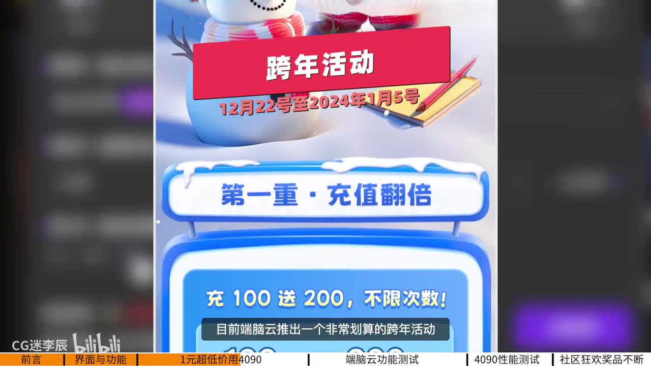 最下面还有个应用数量可以选择,相当于开启多个stable division,适合工作室在线多人使用。如果免费赠送的脑力值不够的话,目前端脑云推出了一个非常划算的跨年活动。在十二月二十二号至二零二四年一月五号期间,用户充一百送两百,也就是充一百元就可以获得三百元的脑力值。