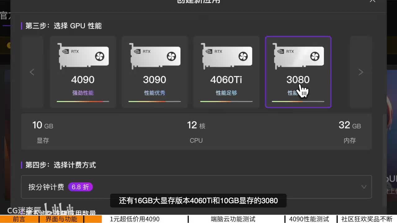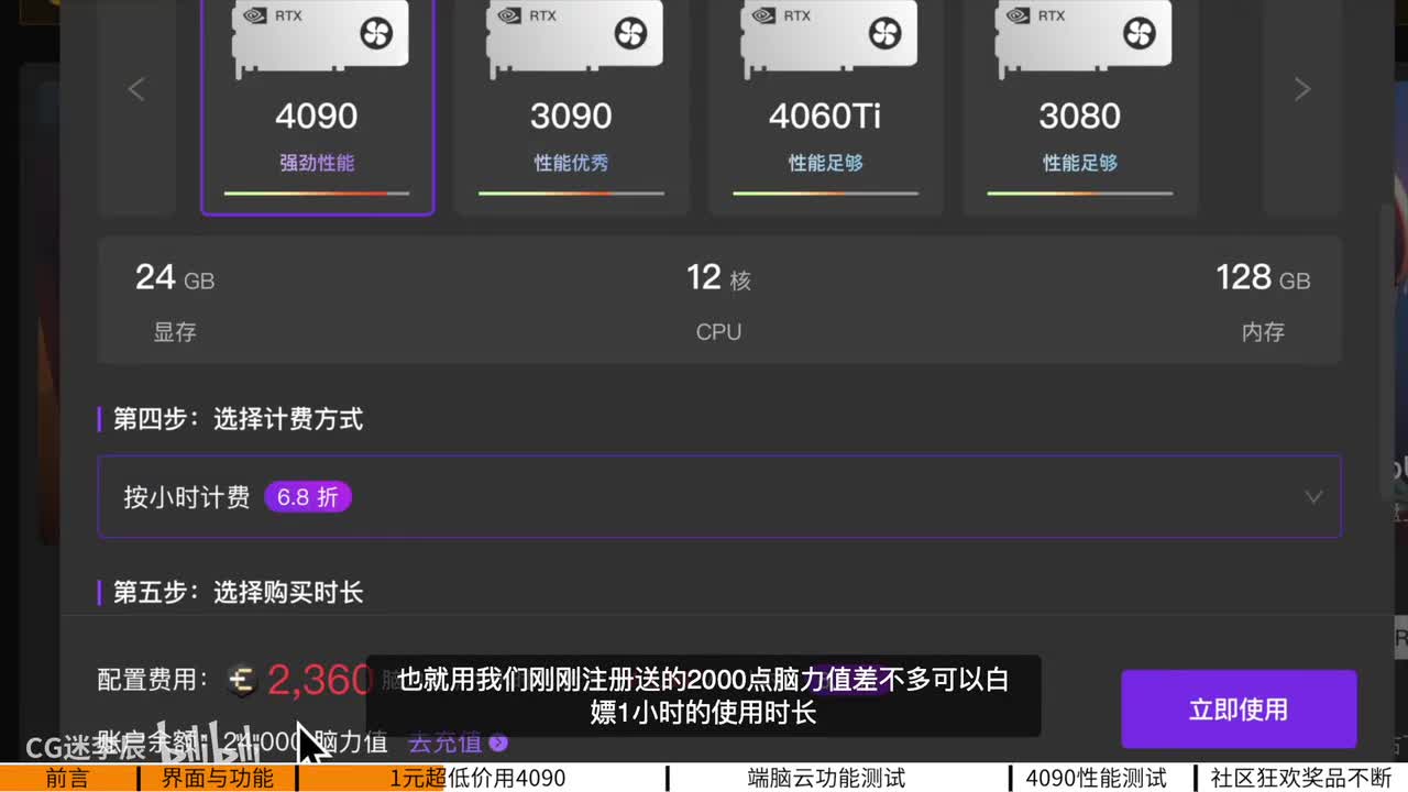 这里显的值是用来抵扣使用显卡,这里一共有四显卡,显卡可以选择分别是具备二十四b超超显显存的三零九零和三零九零顶配显卡,还有十六g b大显存版本的四零六零钛和十g b显存的三零八零。可以选择按分钟、按小时或者是包天、包周、包月不同的计费方式。这里最推荐的是按分钟计费,在我们使用的过程中能够实时。