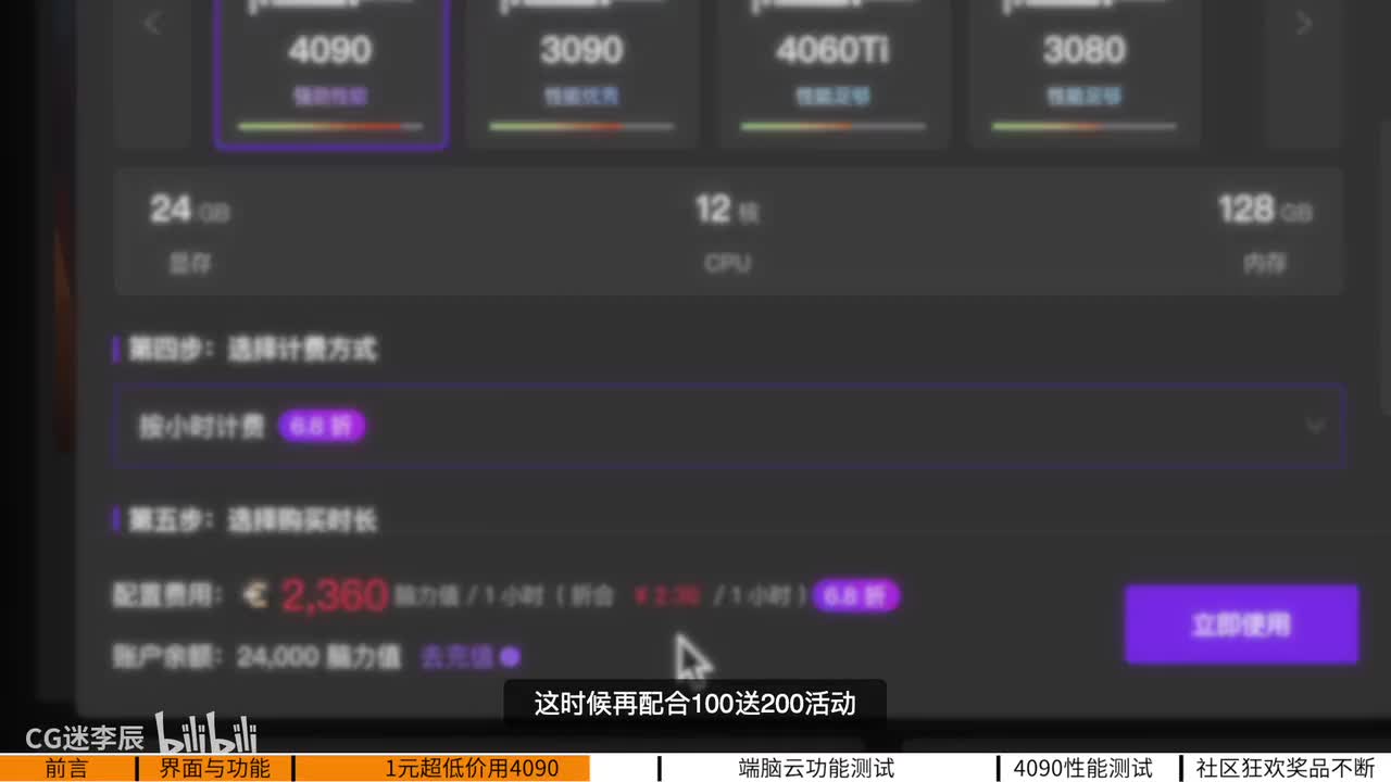 我们来简单算一笔,竖显卡直接选择顶配四零九零按小时计费,四零九零一小时费用仅需二点三六元,这个价格对比全网来说已经是非常的低了。这时候再配合一百送两百活动,相当于四零九零再打个三三折,一小时只需要七毛八连一块钱都不到。充个一百元可以用上一百二十七个小时的四零九零。